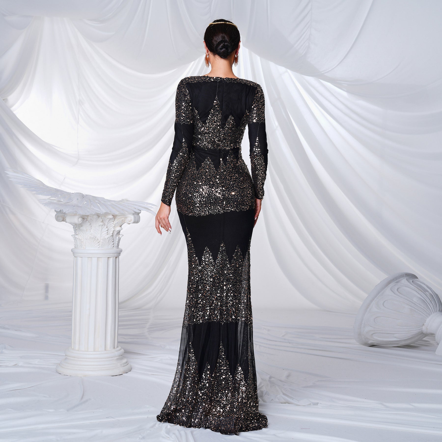 Vفستان سهرة طويل أنيق بأكمام طويلة وقصة ضيقة ومزين بالترتر ورقبة على شكل حرف