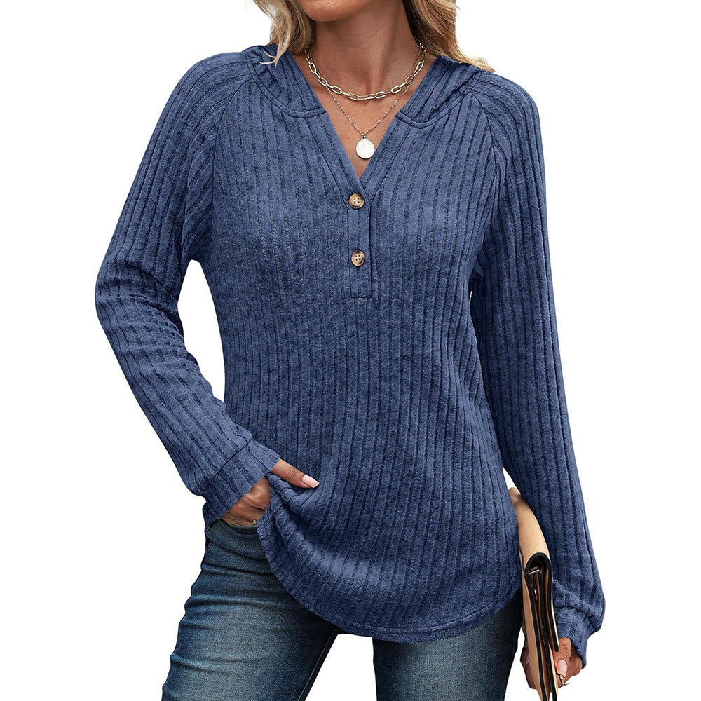 بلوزة محبوكة فضفاضة بغطاء رأس وأزرار وفتحة رقبة على شكل حرف V بلون سادة