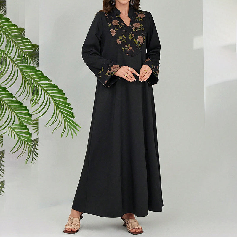 انطلقي في أناقةٍ سلسة مع هذا الفستان البوهيمي ماكسي بمقاس كبير ، مزين بنقشة مرقعة مستوحاة من الشرق الأوسط وطبعة زهور نابضة بالحياة . صُمم هذا الفستان الأسود ذو القاعدة العريضة ليناسب قوامكِ الممتلئ، ويتميز بياقة مدببة أنيقة وأكمام طويلة انسيابية ، ليجمع بين الأناقة المحتشمة وأناقة البوهو الأنيقة . يضمن القماش المسامي راحةً طوال اليوم، مما يجعله مثاليًا لحفلات الزفاف الصيفية، والفعاليات الثقافية، أو لقضاء العطلات.