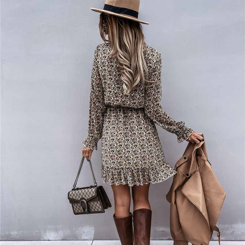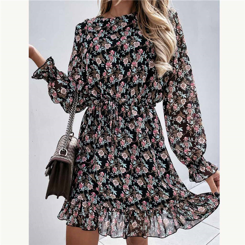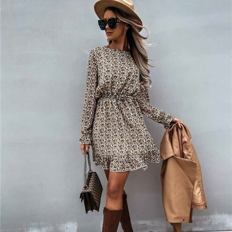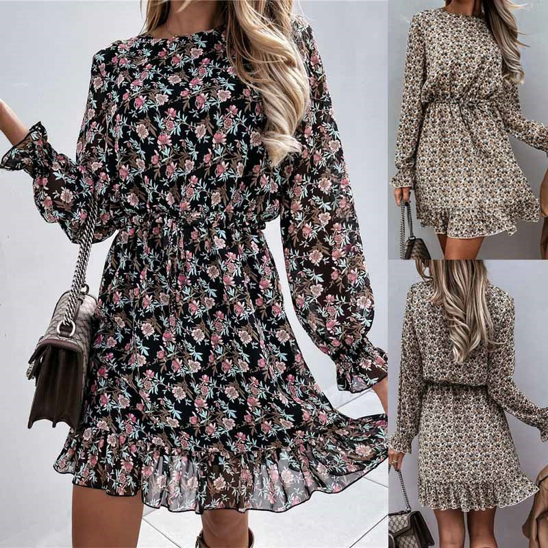 فستان نسائي أنيق مطبوع بأكمام طويلة ورقبة دائرية