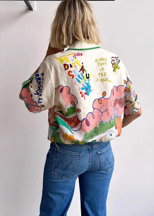 قميص صيفي جميل من الكتان بياقة بيتر بان وطبعة جرافيكية