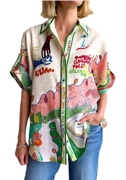 قميص صيفي جميل من الكتان بطبعة جرافيكية وياقة بيتر بان