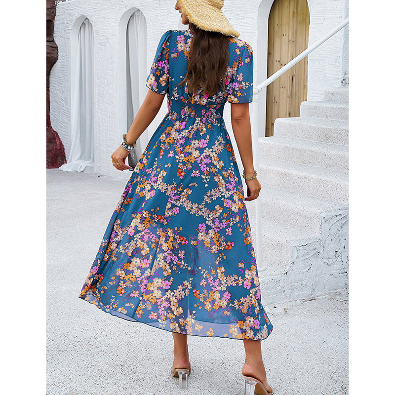 تمتعي بإطلالة رومانسية وعفوية مع فستان ميدي نسائي بأكمام منفوخة مزين بالزهور. يجمع هذا الفستان المصمم بأناقة بين طبعة زهور رقيقة تغطي كامل الفستان وأكمام منفوخة ساحرة تضفي لمسة أنثوية مستوحاة من الطراز القديم. يوفر خط العنق على شكل حرف V الأنيق والخصر المرتفع المطاطي المزين بتفاصيل مكشكشة مقاسًا مريحًا وقابلًا للتعديل يُبرز جمال قوامك. ينسدل الفستان بانسيابية إلى تنورة تصل إلى الركبة، مما يجعله مثاليًا لتجمعات الصيف، وحفلات الحدائق، وعطلات الشاطئ، أو كزي أنيق لحضور حفلات الزفاف. خفيف الوزن وأنيق بكل سهولة، إنه خيارك الأمثل لأيام الصيف المشمسة والمناسبات الخاصة.
